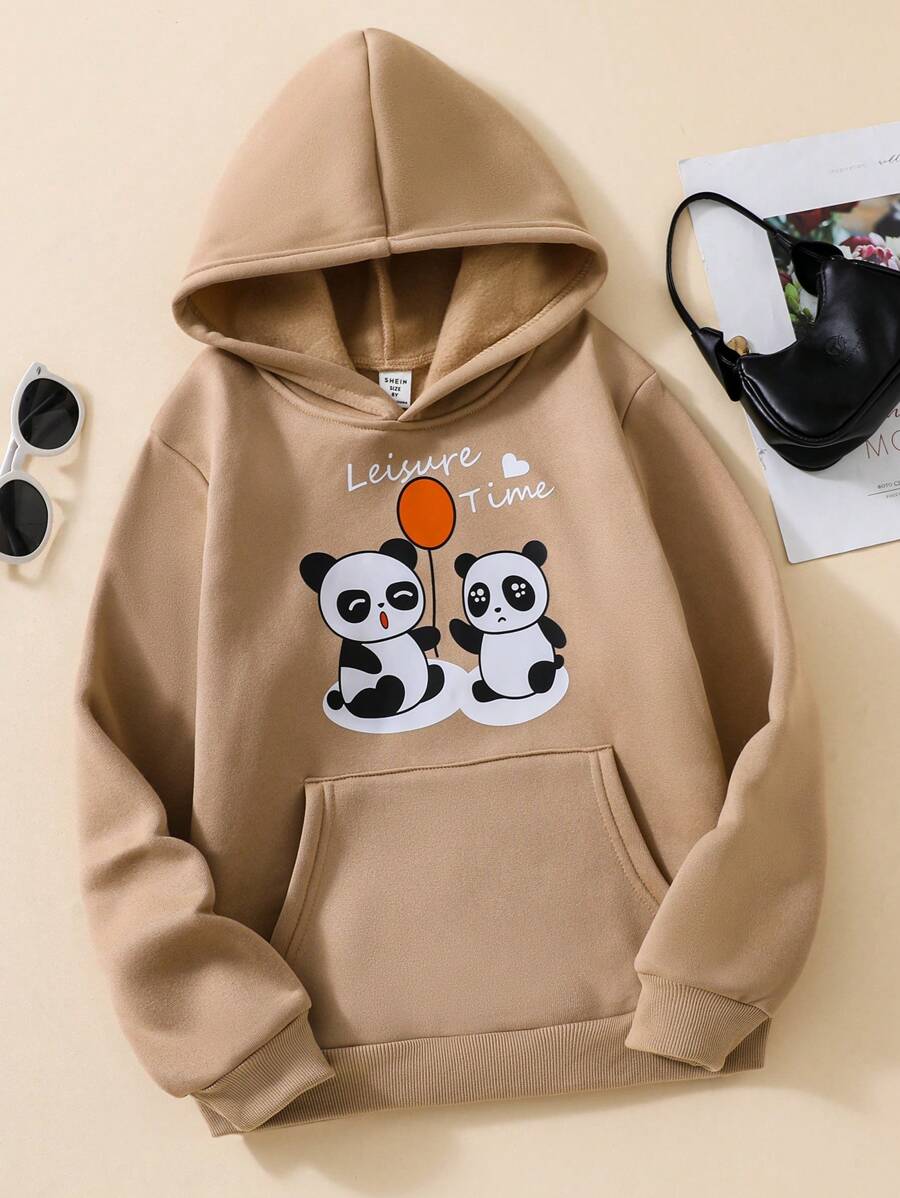 SHEIN Kids Nujoom Tween Girl Panda & Slogan Graphic Kangaroo Pocket Thermal Lined Hoodie