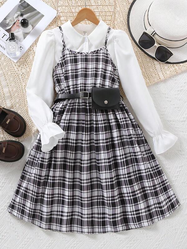 Tween Girl Plaid Print Cami Dress & Flounce Sleeve Blouse & Belt Bag