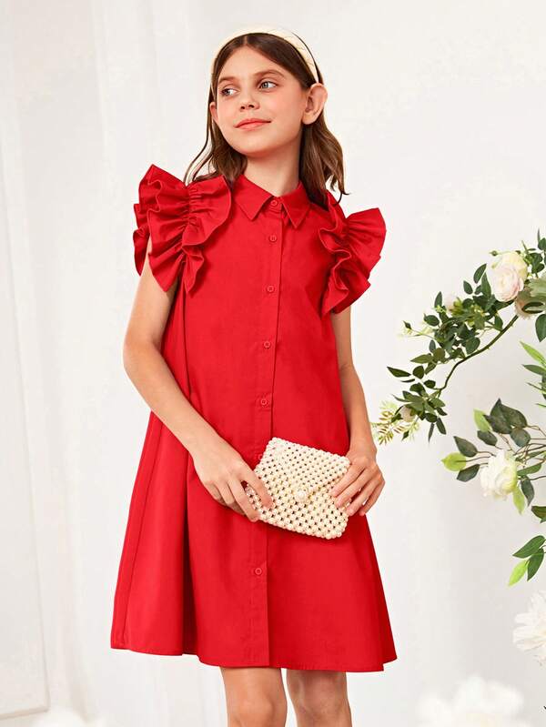 SHEIN Kids EVRYDAY Tween Girl Ruffle Trim Button Front Shirt Dress
