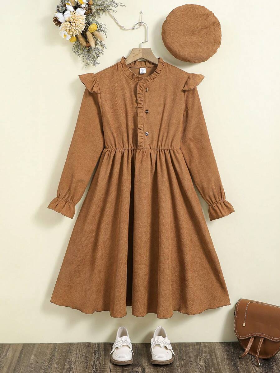 SHEIN Kids Nujoom Tween Girl Ruffle Trim Half Button Dress With Hat