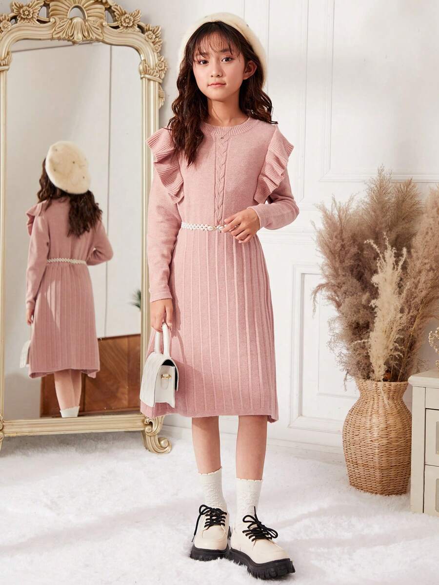 SHEIN Kids KDOMO Tween Girl Ruffle Trim Sweater Dress Without Belt