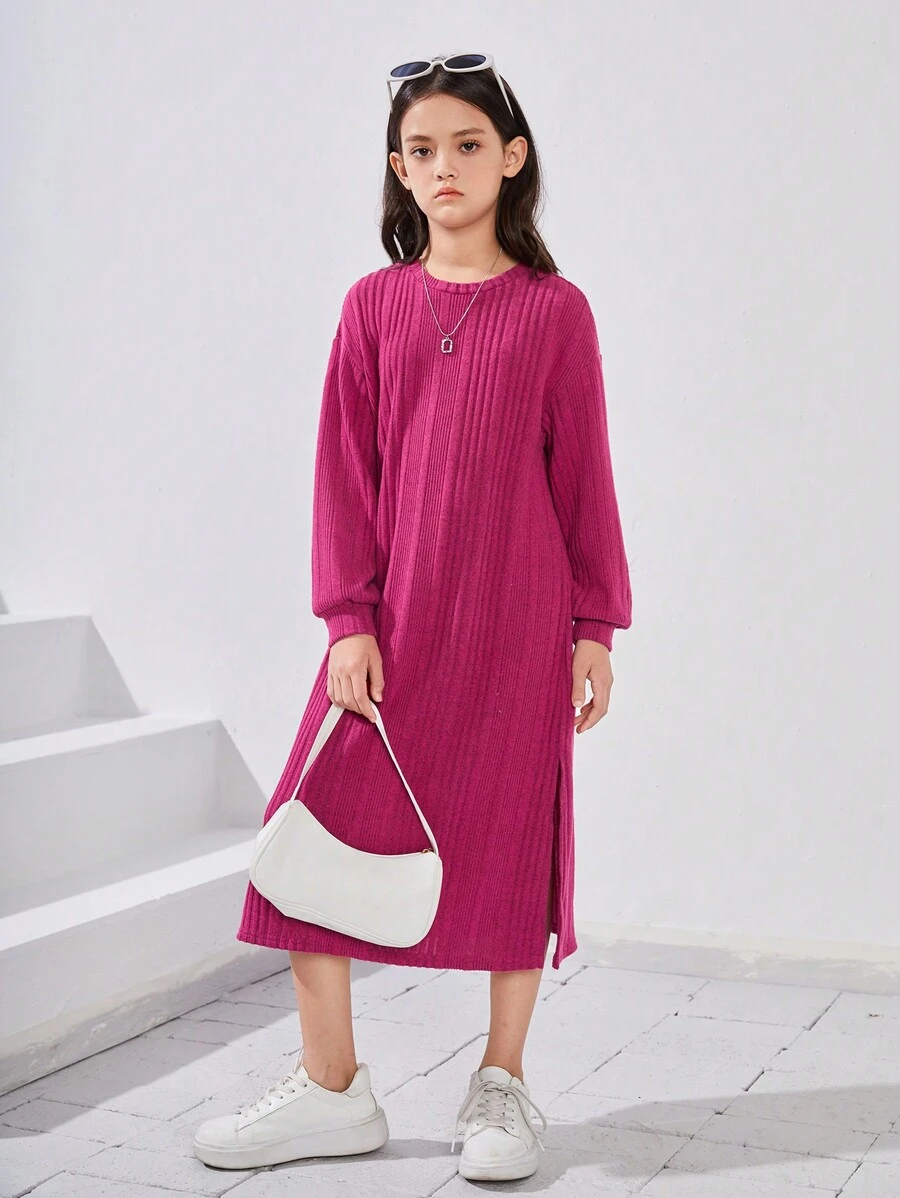 SHEIN Kids Nujoom Tween Girl Solid Split Hem Drop Shoulder Dress