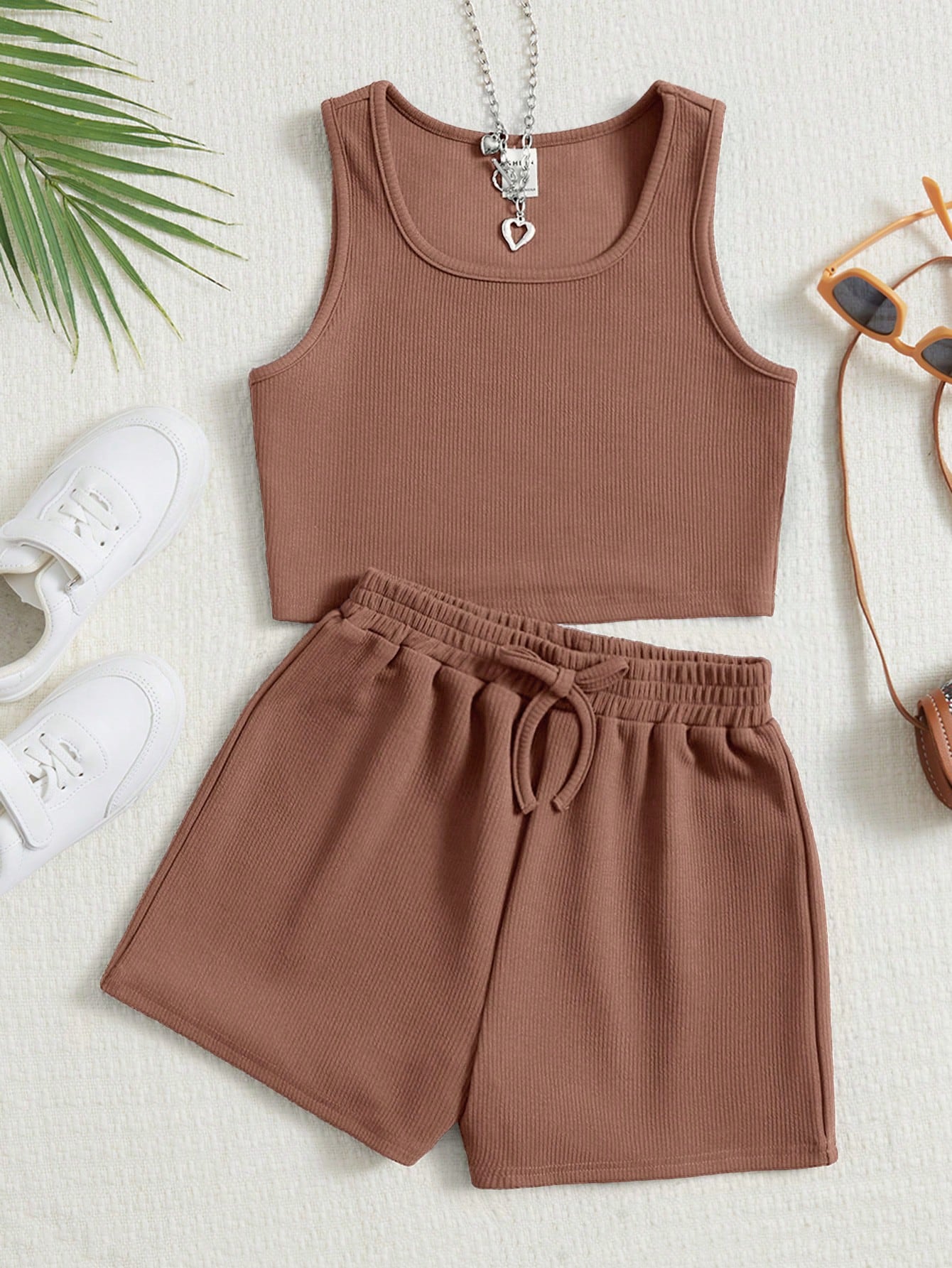 SHEIN Kids EVRYDAY Tween Girl Solid Tank Top & Drawstring Waist Shorts