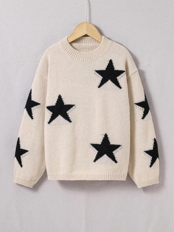 Tween Girl Star Pattern Drop Shoulder Sweater