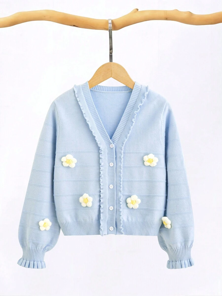 Tween Girl Stereo Flower Frill Trim Flare Sleeve Cardigan