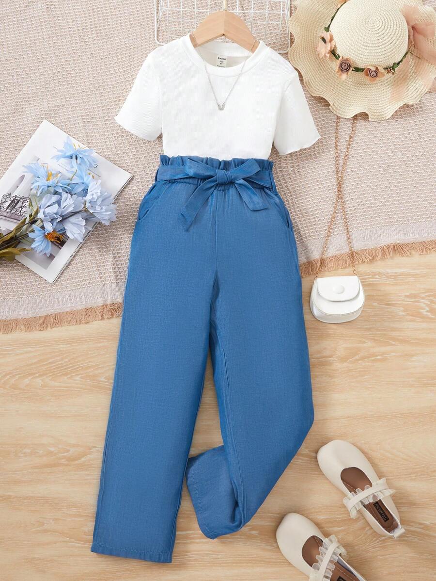 SHEIN Kids EVRYDAY Tween Girl Tee & Paperbag Waist Belted Pants