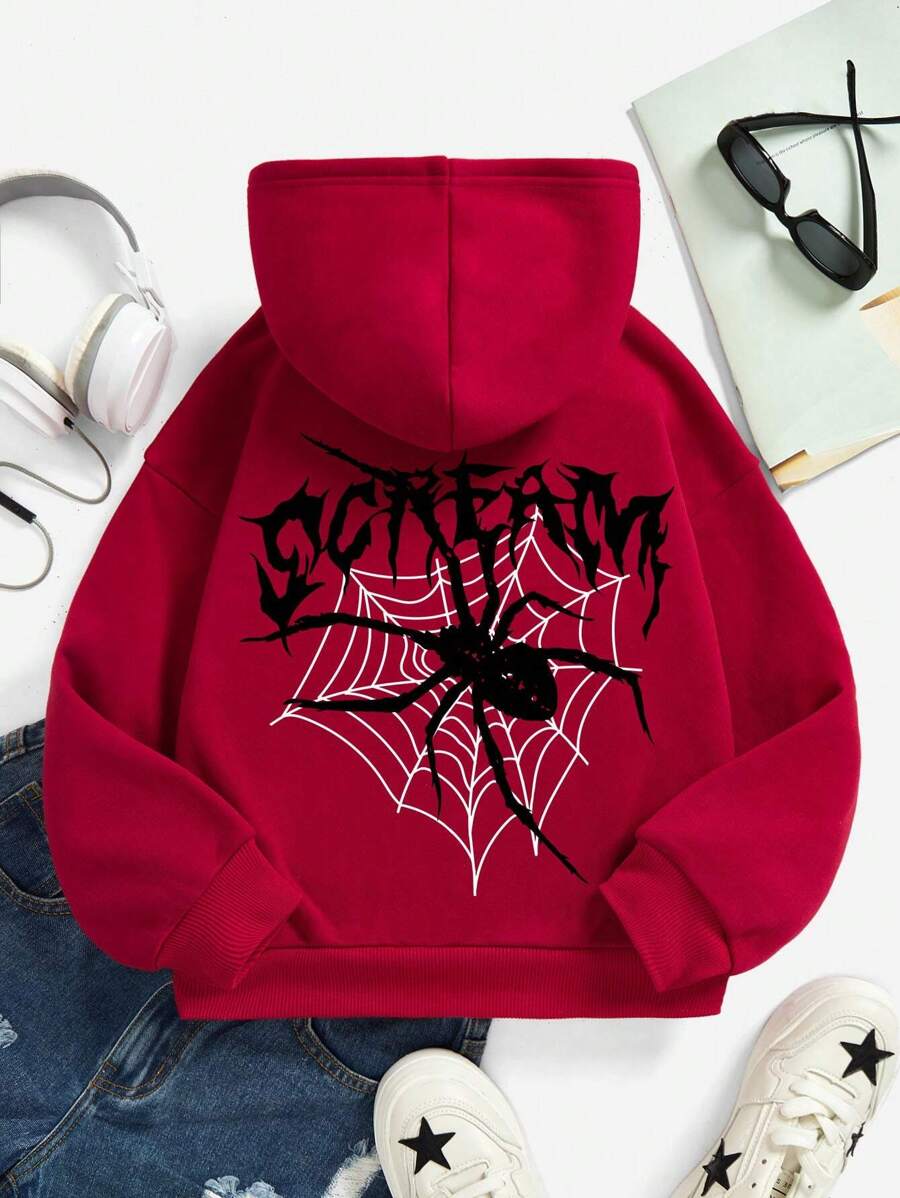 Tween Girls' Casual Spider And Letter Print Long Sleeve Hoodie Suitable For Autumn And Winter