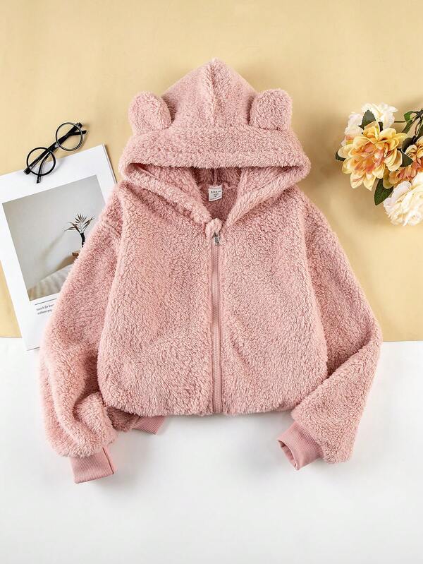 Tween Girls' Hooded Plush Jacket With Cute Ears And Zipper Front