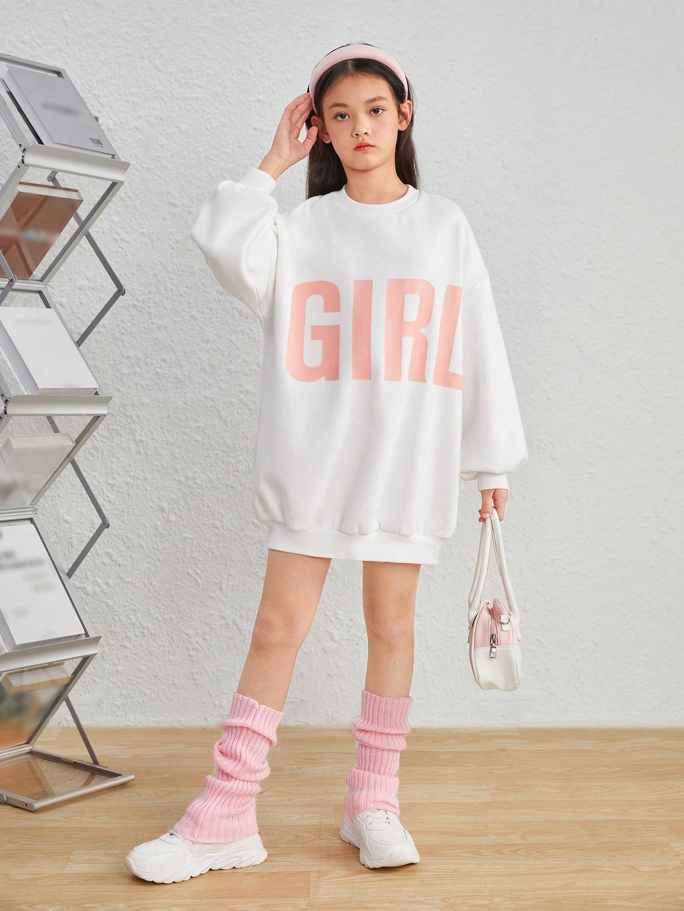 SHEIN Kids KDOMO Tween Girls' Loose Fit College Style Round Neck Big Letter Print Sweatshirt Dress