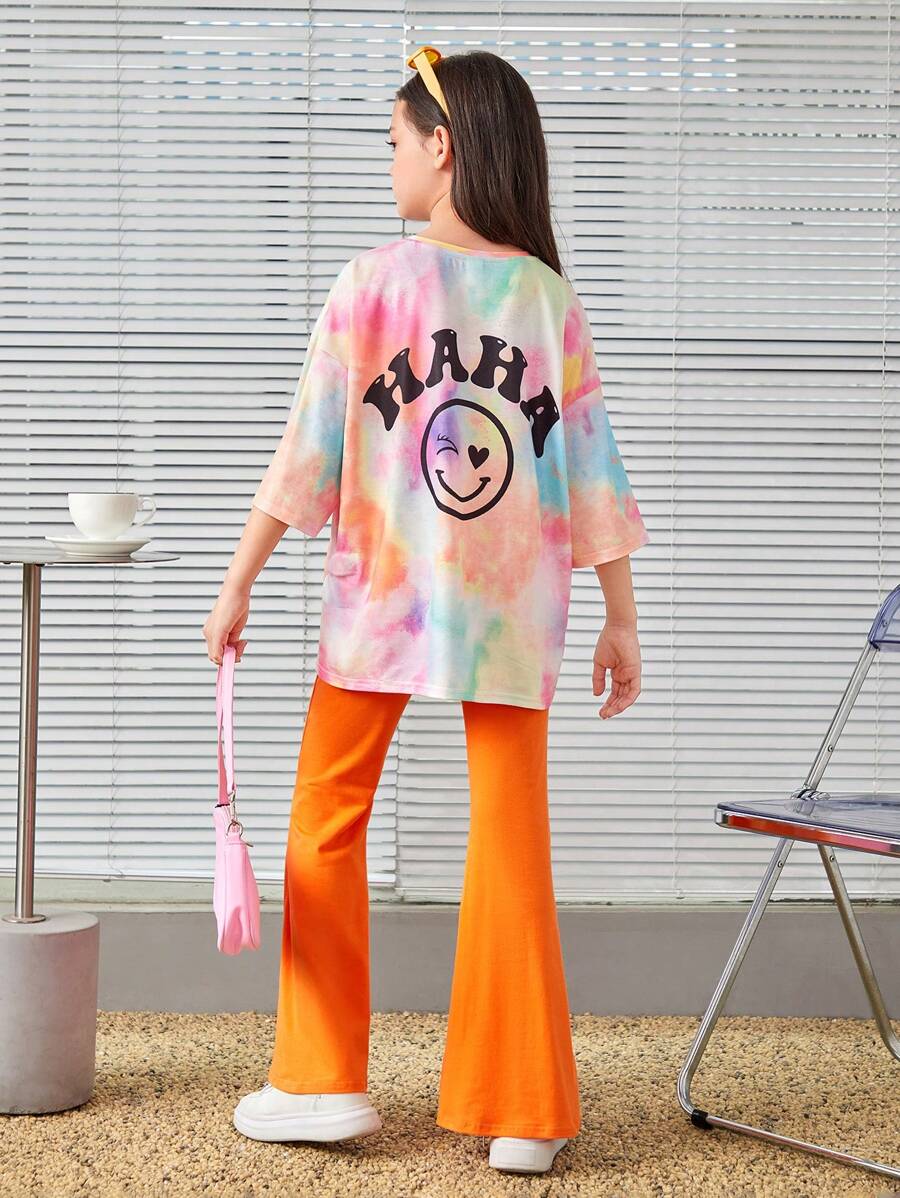 SHEIN Kids Nujoom Tween Girls' Loose Vintage Tie Dye Emoticon & Letter Print T-shirt And Flared Pants Two-piece Set