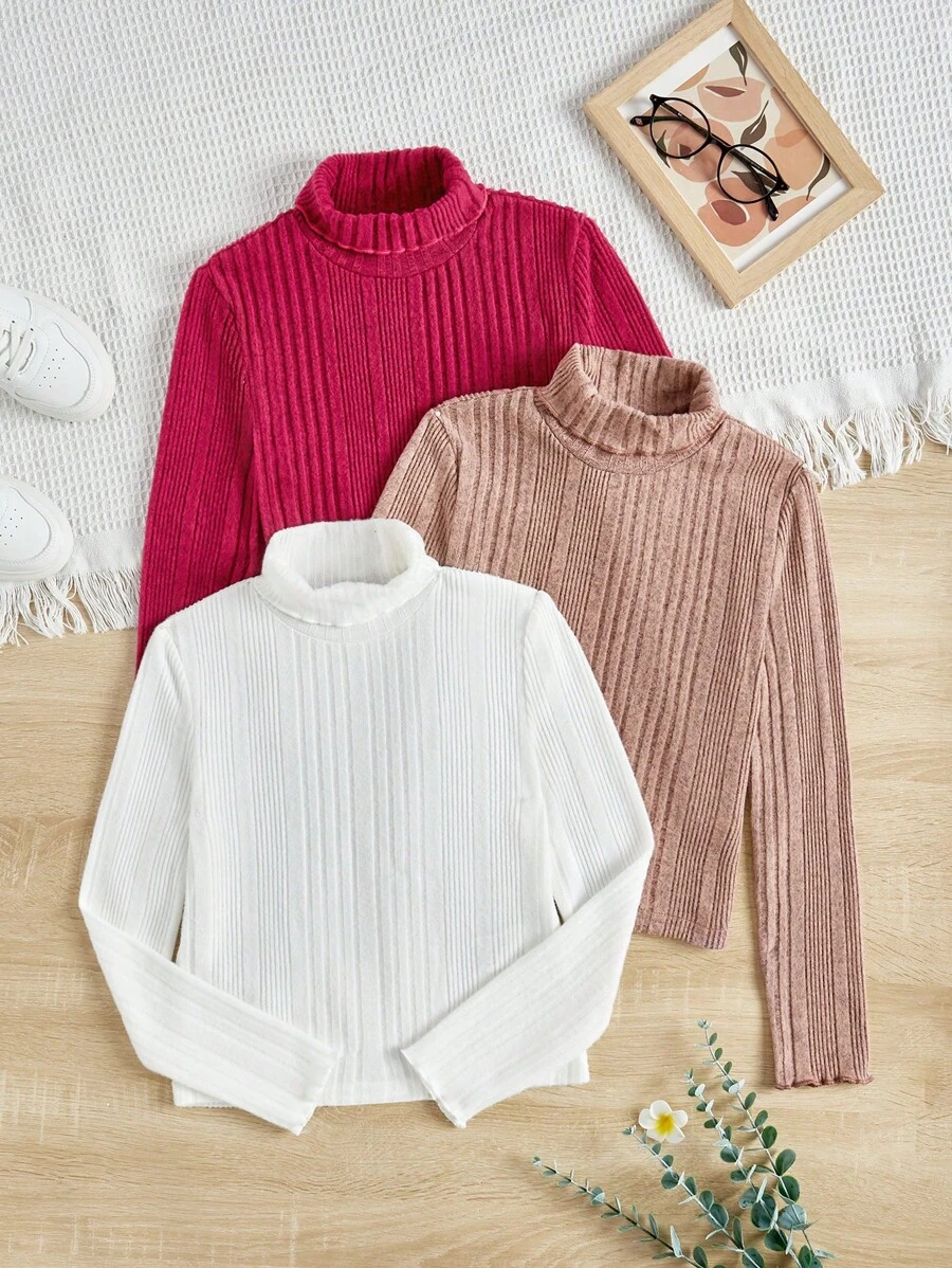 SHEIN Kids KDOMO Tween Girls' Slim Fit High Neck Long Sleeve Striped T-Shirts, Pack Of 3