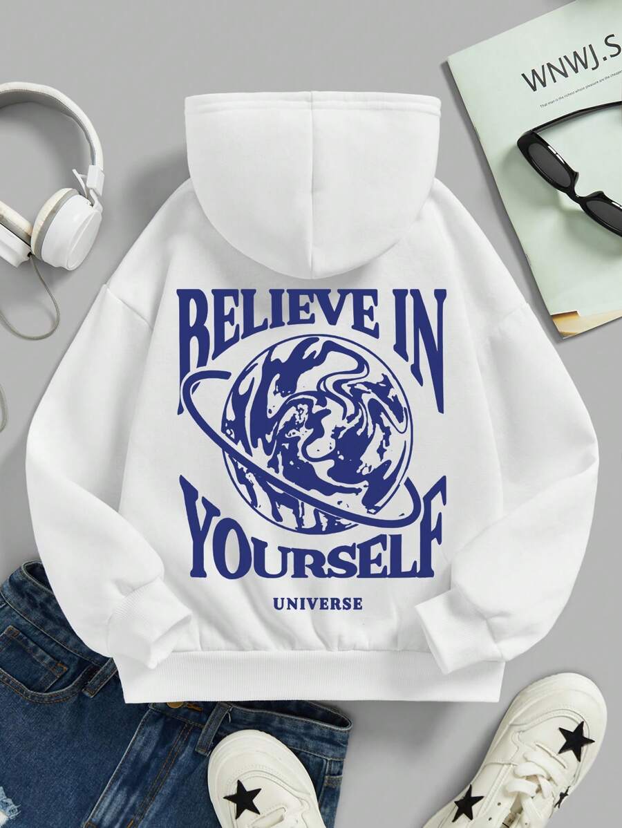 Tween Girls' Slogan Printed Hooded Sweatshirt, Casual And Comfortable