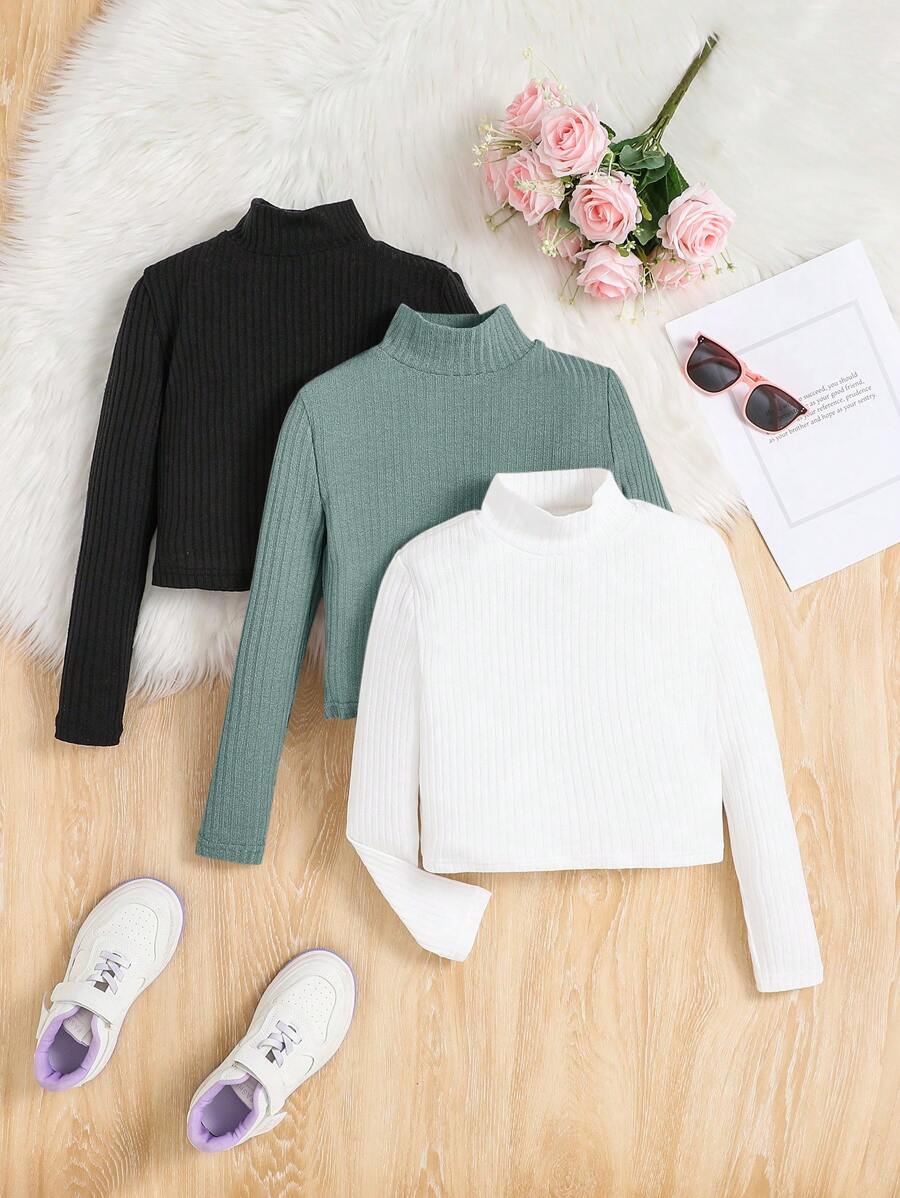 SHEIN Kids EVRYDAY Tween Girls' Solid Color Stand Collar Casual T-Shirt Set (3 Pieces)