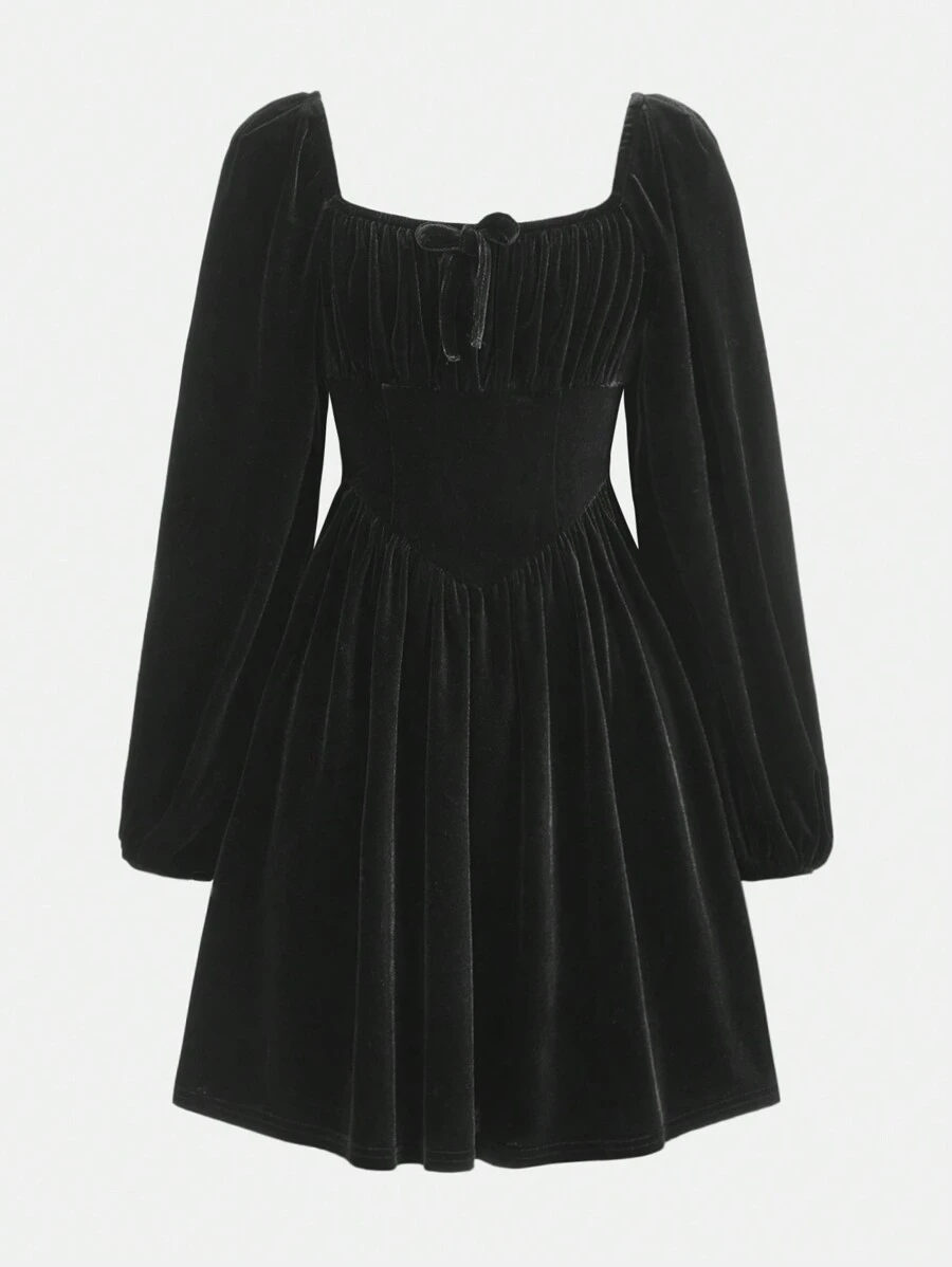 SHEIN Kids Cooltwn Tween Girls' Sporty Casual Velvet Solid Color Square Neck Long Sleeve Dress