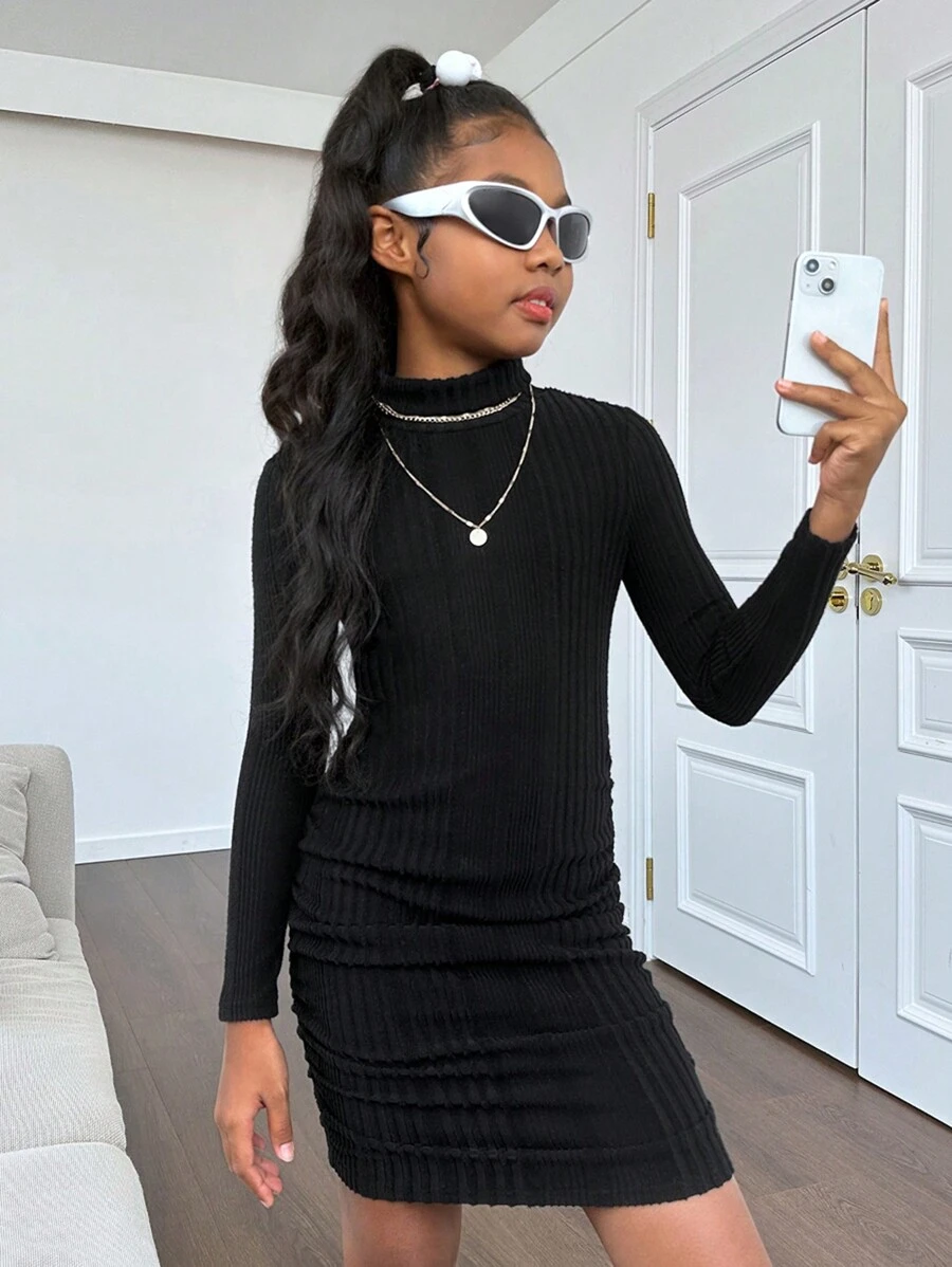 SHEIN Kids Cooltwn Tween Girls' Sporty Street Style Knitted Solid Color Mini High Neck Long Sleeve Dress