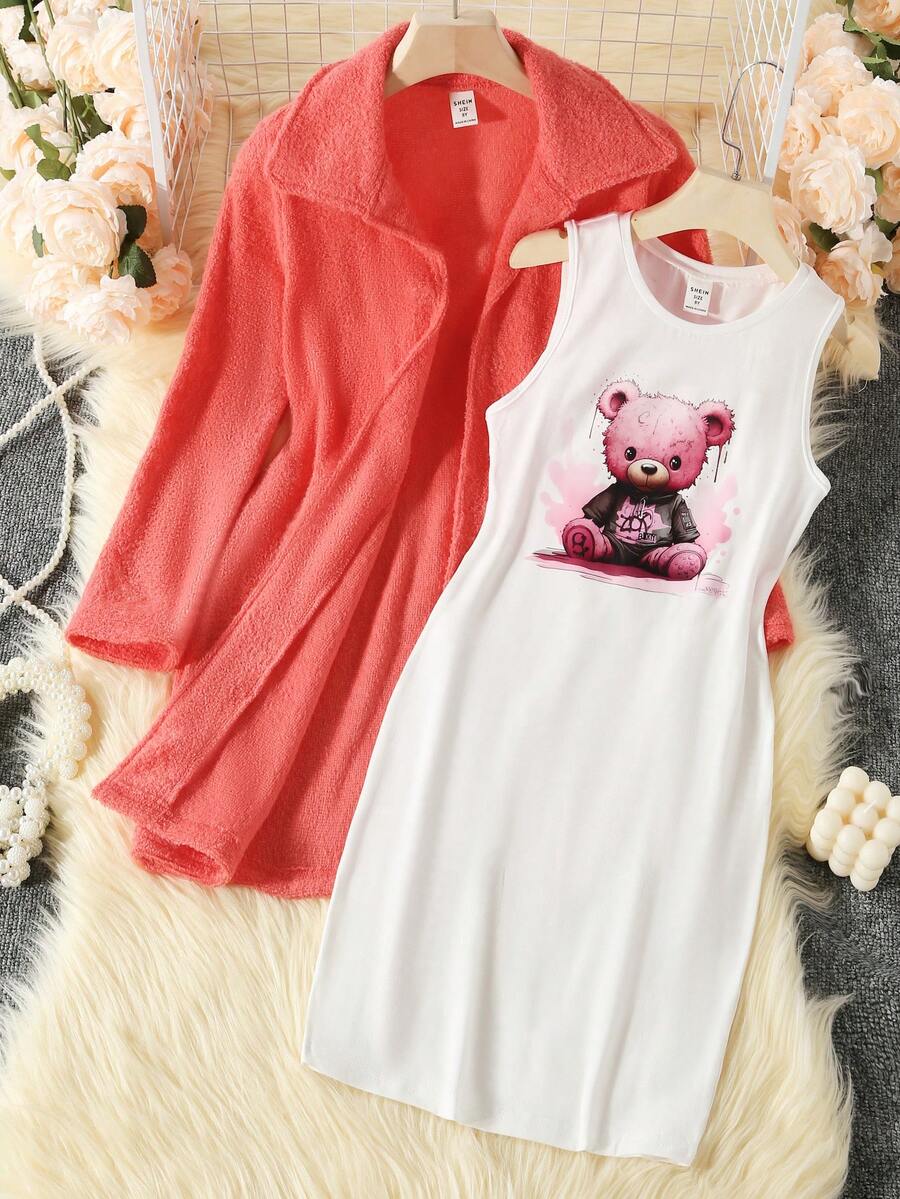 SHEIN Kids Nujoom Tween Girls Cartoon Graphic Tank Dress & Open Front Coat