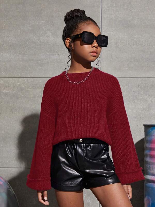 SHEIN Kids Cooltwn Tween Girls Drop Shoulder Fuzzy Cuff Sweater