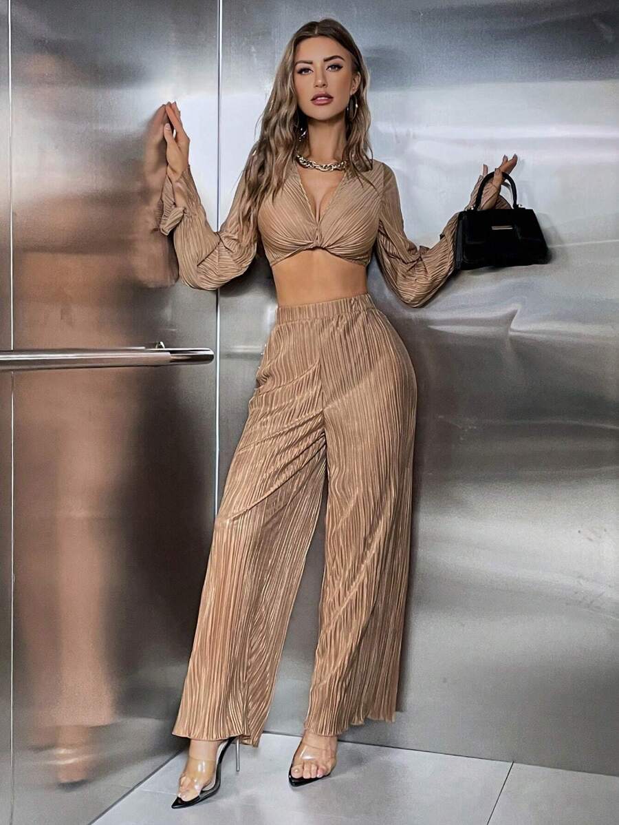 SHEIN Privé Twist Front Crop Top & Flare Leg Pants