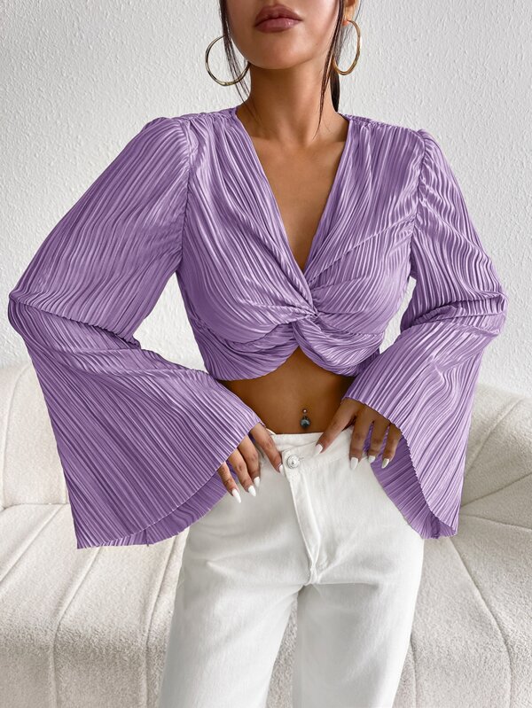 SHEIN Privé Twist Front Flounce Sleeve Plisse Crop Top