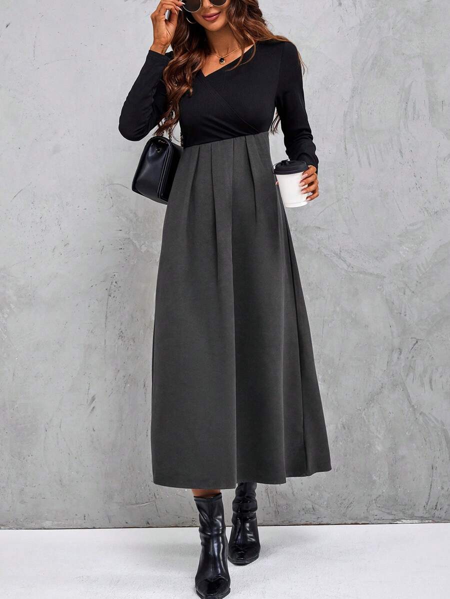 Two Tone Asymmetrical Neck Fold Pleated Hem Dress