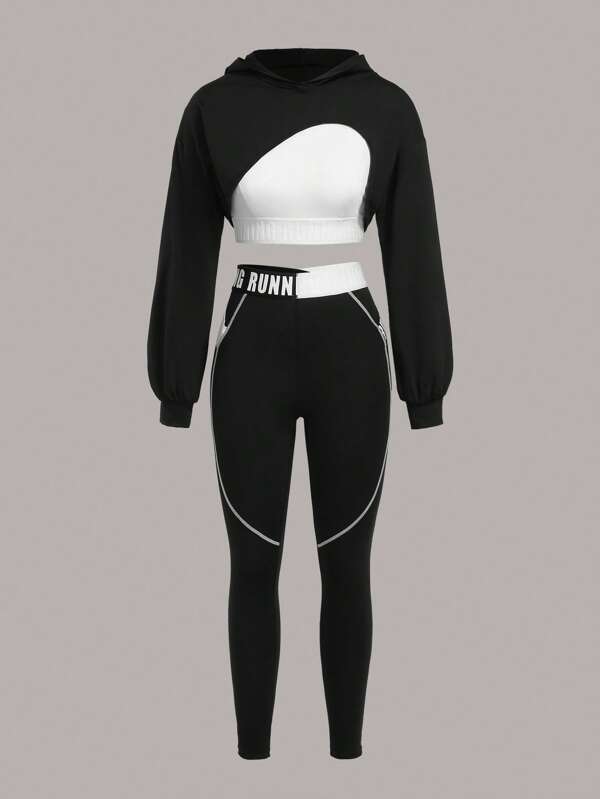 SHEIN Running Two Tone Contrast Letter Tape Drop Shoulder Hoodie & Leggings