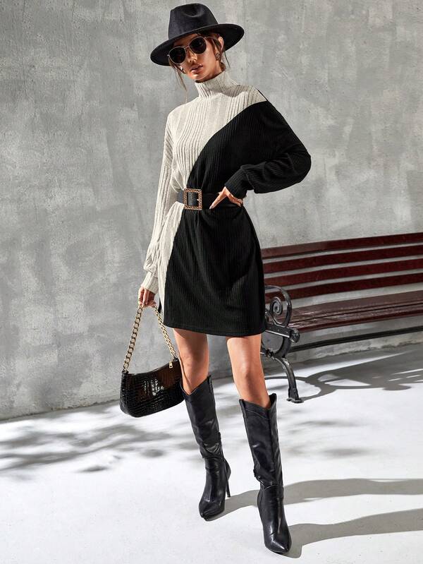 SHEIN Frenchy Two Tone High Neck Drop Shoulder Dress Without Belt