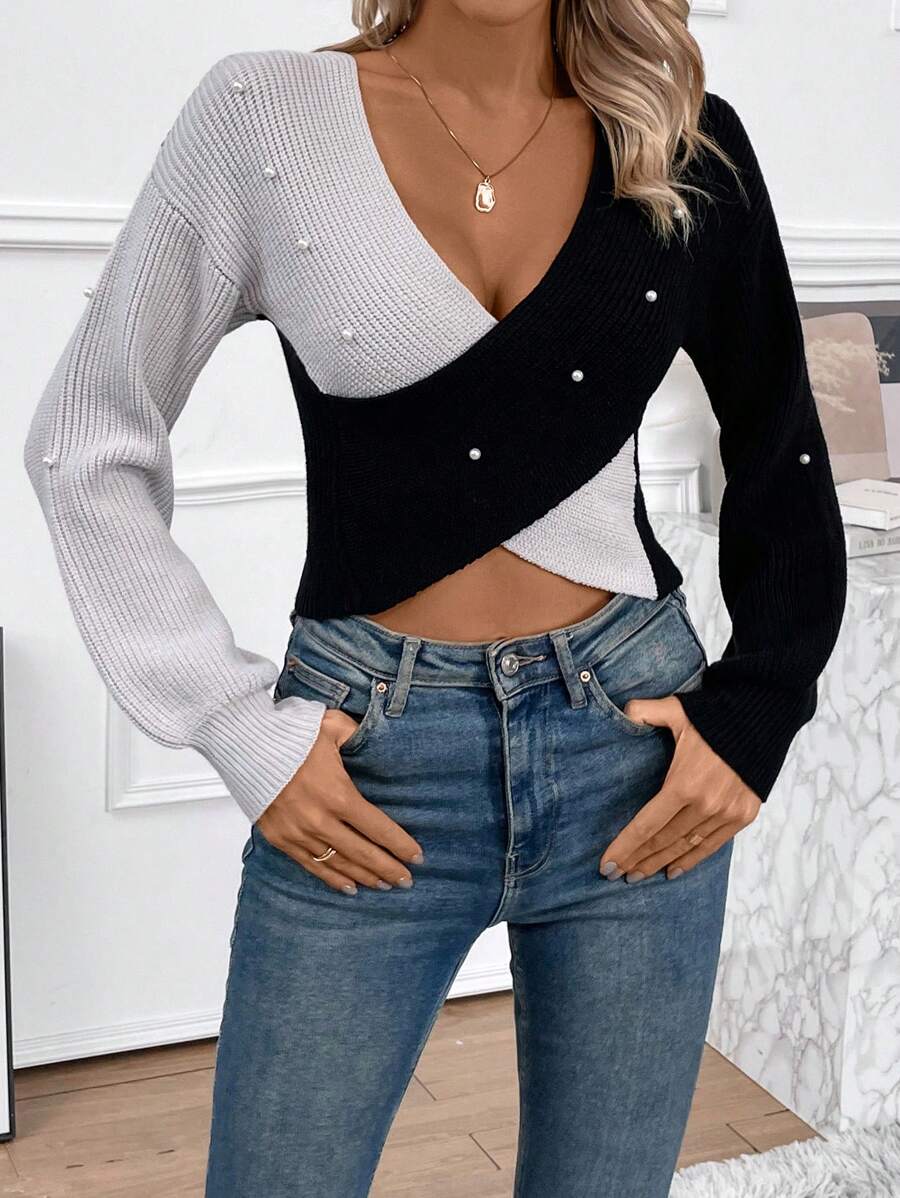 SHEIN Frenchy Two Tone Pearls Beaded Crossover Crop Sweater