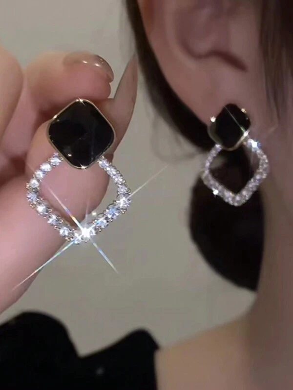 Uncommon Vintage Black Rhombus Design Slimming Geometric All-Matching Rhinestone Earrings, Sophisticated And Luxurious