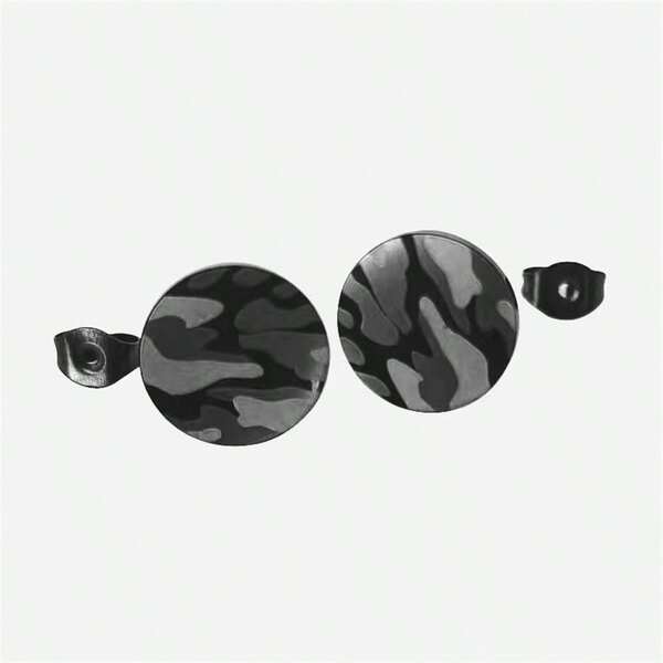 Unisex Black Camouflage Stainless Steel Round Stud Earrings, Cool Style For Men And Women