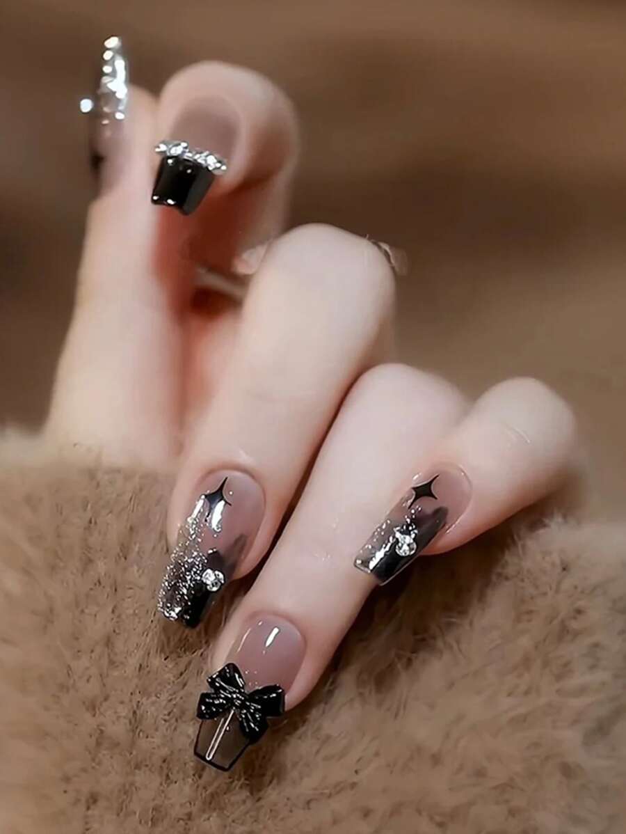 Upgrade Your Look 24pcs/set Medium-long Coffin Shape Black-silver Butterfly Design Nail Tips With 1pc Jelly Gel And 1pc Nail File For Parties, Dances And Daily Wear