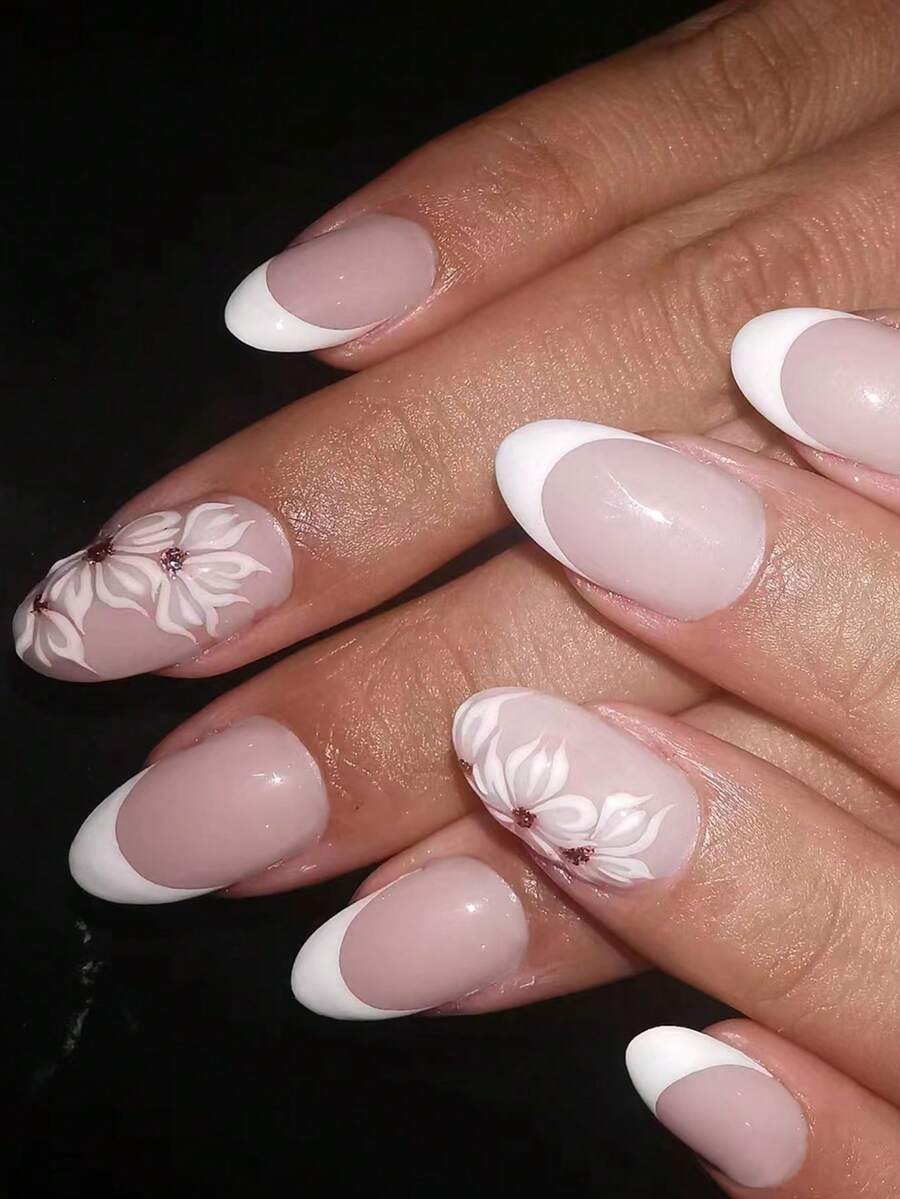 Upgrade Your Look Now With 24 Pieces Of Almond-Shaped White Flower French Wear Manicure, For Women And Girls Fully Covered With Fake Nails