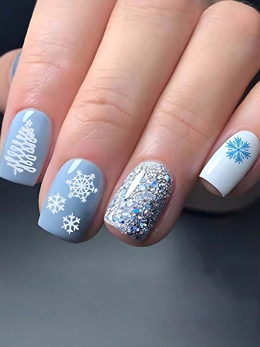 Upgrade Your Look With 24pcs Short Square Shape, Deep Blue Color & Christmas-themed, Fashionable, Geometric Lines & Simple Design, Cute And Elegant Style, Mix And Match Nail Art Set, Detachable False Nail Sticky Patches, Suitable For Holiday, Party, Date, And Daily Wear
