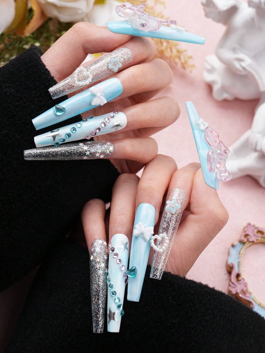 Upgrade Your Look With New 10pcs Handmade Exclusive Design New Year Valentine Extra Long 3D Nails Y2K Cute Blue Press On Nails With 3D Bowknot, Easy To Wear