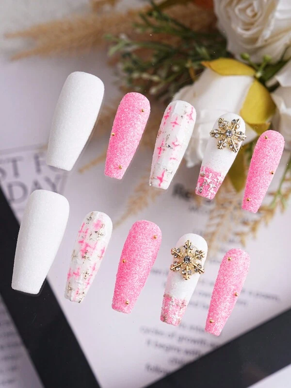 Upgrade Your Look With New 10pcs Handmade Exclusive Design New Year Valentine Long 3D Nails Y2K White Shimmer Cute Pink Press On Nails With 3D Rhinestones, Easy To Wear