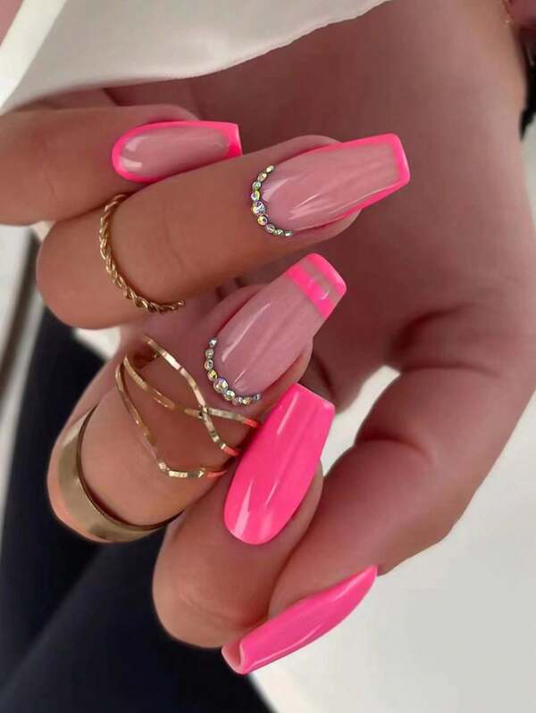 Upgrade Your Nail Art With 24pcs French Pink Edge Coffin Shape Long 3d Rhinestone Glittery Nail Tips Suitable For New Year And Valentine'S Day Wear + 1pc Jelly Gel + 1pc Nail File