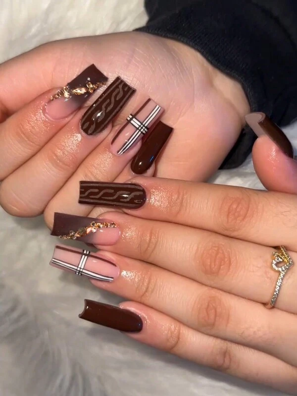 Upgrade your appearance immediately, 24 piece medium long square nail piece autumn and winter brown champagne drill flash nail removable false nail set, including 1 nail file and 1 jelly gel, suitable for women and girls to use daily