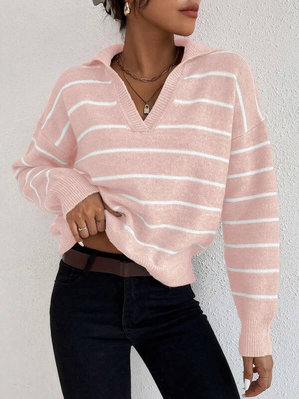 SHEIN Frenchy V-Collar Long Sleeve Striped Pullover Sweater