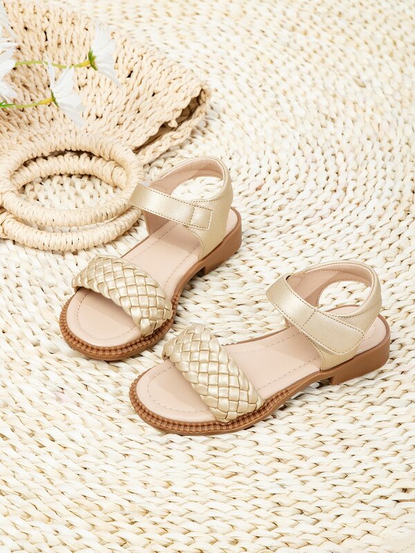 Vacation Gold Ankle Strap Sandals For Girls, Braided Detail Hook-and-loop Fastener Sandals