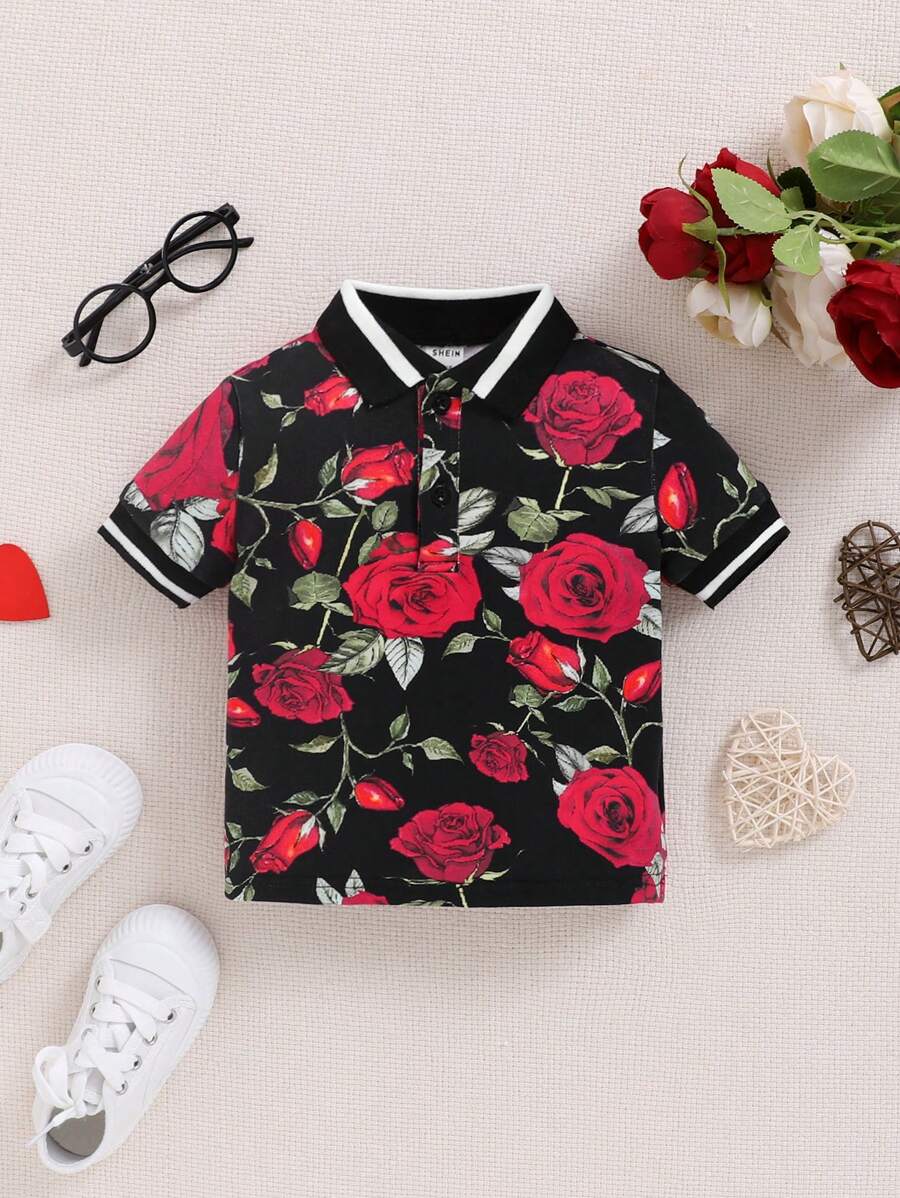 SHEIN Valentine'S Day Baby Boy Rose Pattern Flat Collar Short Sleeve Top