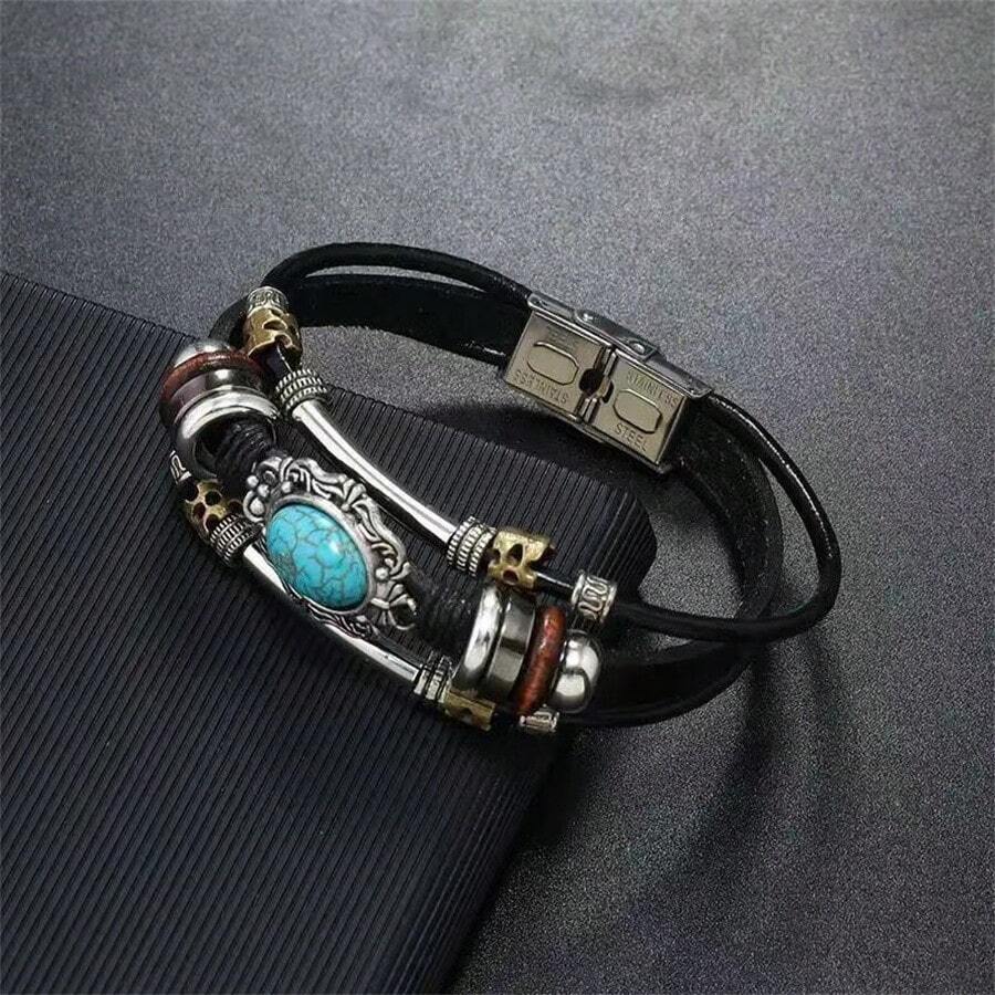 Vintage & Personalized Multi-Layer Men's Clasp Fashion Bracelet, Cross Border Beaded Leather Turquoise Bracelet