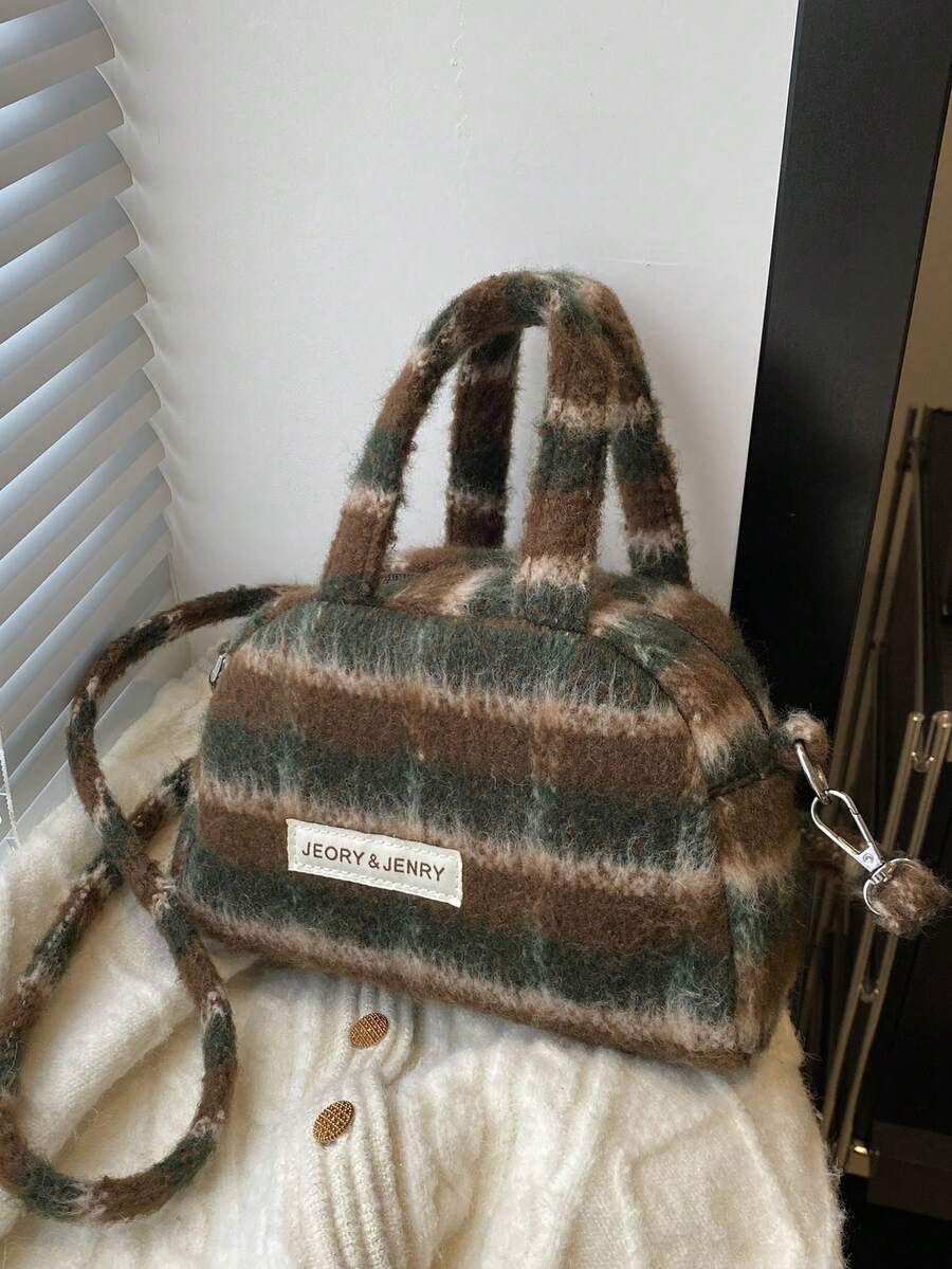 Vintage Minimalist Plaid Woolen Crossbody Bag With Furry Decoration For Women, Shoulder Bag, Handbag