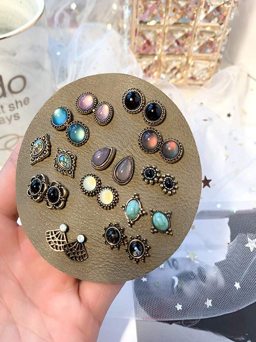 Vintage Turquoise & Cat Eye Stone Inlaid Earrings Set (12pairs)