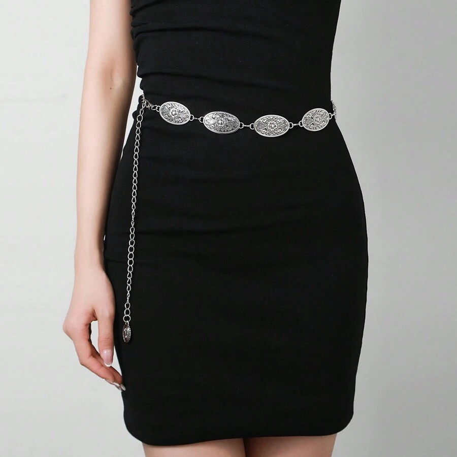 Vintage Western Style Antique Silver Carved Metal Waist Chain For Women, Fashionable Sweater Chain Decoration, In Stock