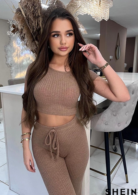 SHEIN PETITE Waffle Knit Crop Tee & Tie Waist Leggings Set