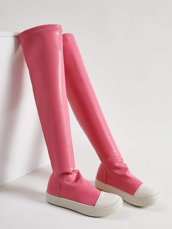 Waterproof Platform Thick Sole Elastic Over-the-knee Boots, Fashionable Slim Fit Thigh High Casual Pink Sports Boots