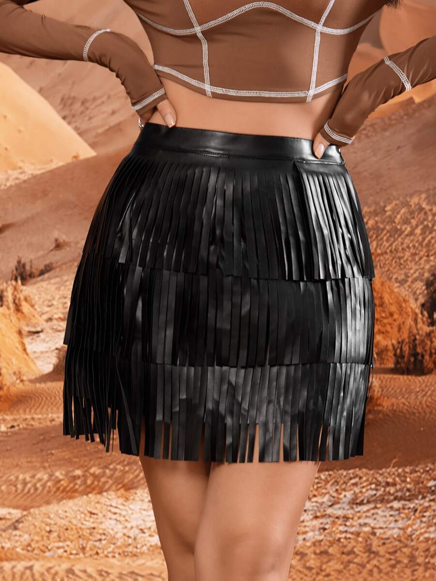 SHEIN ICON Western High Waist Fringe Hem PU Leather Skirt