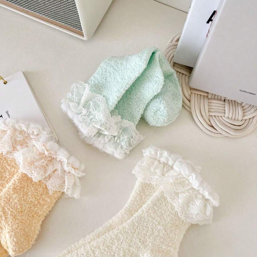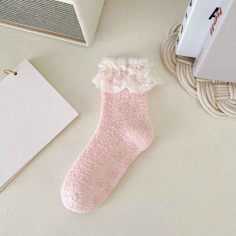 Winter New Arrival Thickened & Warm Coral Fleece Anti-Skid Socks With Lace, Women Half Velvet Fleece Sleep Socks