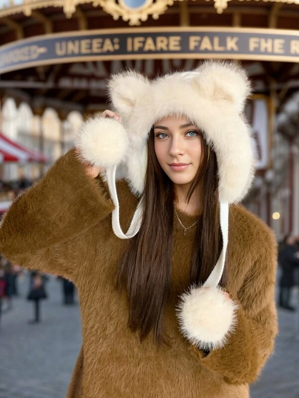 Winter Warm Ear Flap Hat For Women, Korean Style Thick Plush Knitted Hat With Cute Cat Ear, Woolen Headgear