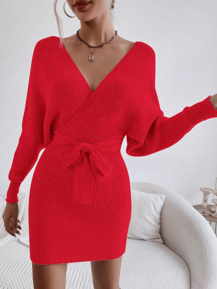 SHEIN Privé Women'S Batwing Sleeves Knitted Sweater Dress With Waist Belt