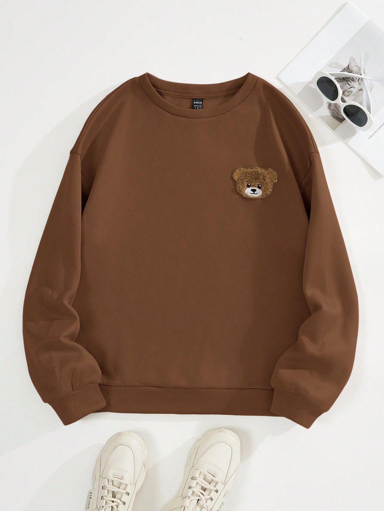 SHEIN EZwear Women'S Cartoon Bear Embroidery Towel Fabric Round Neck Sweatshirt